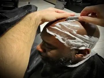 Classic hot towel head shave in Manchester, NH. Includes hot & cold towels and a complimentary drink.